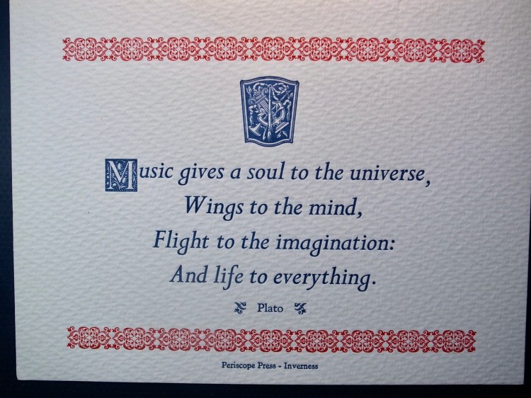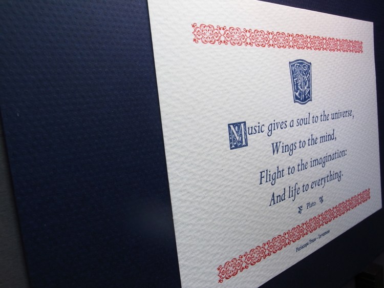This print, measuring 7.25” x 5.5”, is printed on Blockingford 425g, from St Cuthbert’s Mill, and mounted on a blue A4 board. The succinct words of Plato, will surely appeal to anyone who loves music. The rather beautiful ‘Lyre’ block was cast by the American Type Foundry, probably in the 1930’s, and I am lucky to have it.